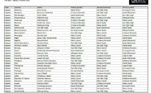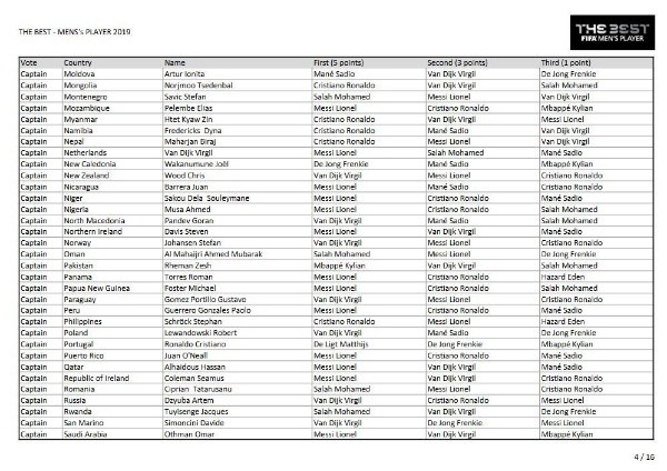 Messi se quedó con el galardón al mejor jugador del año de la FIFA gracias a 46 puntos, seguido por Virgil van Dijk (38) y Cristiano Ronaldo (36).