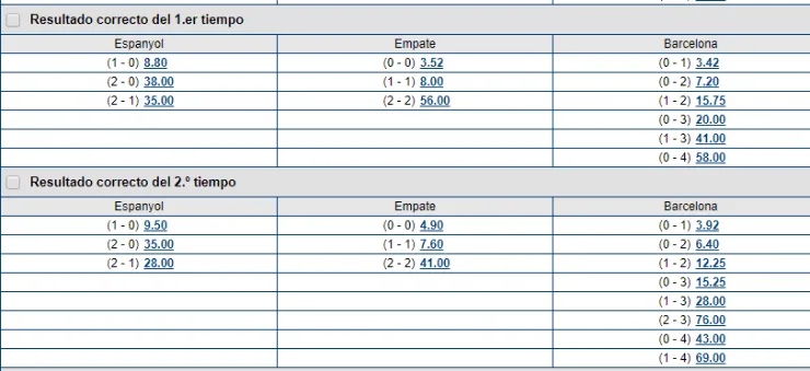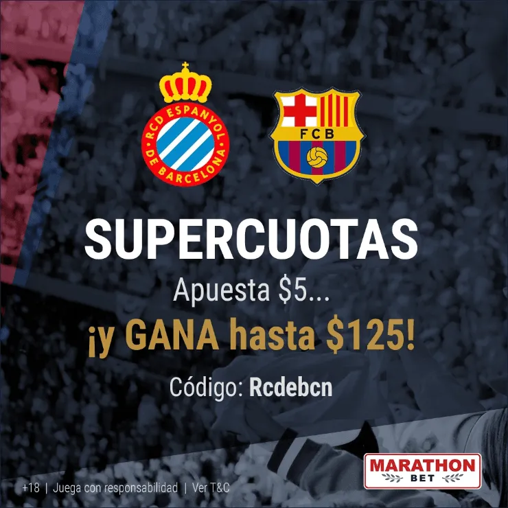 Y es que de la mano de Marathonbet puedes disfrutar aún más de este partido. Aprovecha la Supercuota especial de Espanyol y Barcelona. Porque en este partido, el favorito es el Barcelona, cuyo triunfopaga 5.00 veces lo que juegues, garcias a las Supercuota de Marathonbet. Mientras que si vas por Espanyol, paga 25.00 veces lo apostado. Es decir, si apuestas $5 (o equivalente a moneda local) puedes ganar hasta $125 (o equivalente a moneda local).Además del Bono de Bienvenida de Marathonbet, donde depositas 60$ y juegas con 90$ (o equivalente a moneda local). Todo con el código promocionalRcdebcn.
