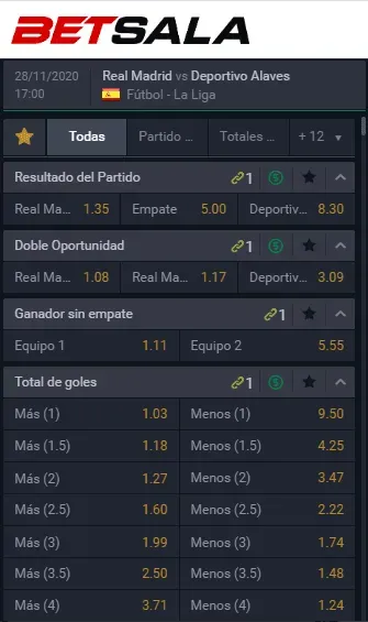 Betsala te cuenta que el favorito para ganar este partido de la Liga de España es el Real Madrid, que paga 1.35 veces lo que juegues, por sobre los 8.30 que paga el Deportivo Alavés, si piensas que ellos vencerán. Ahora, el empate paga 5.00 veces lo que apuestes.