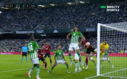 Bravo y el Betis reclamaron carga contra el meta, pero el VAR revisó la acción descartando la falta de Gabriel Paulista contra el chileno.