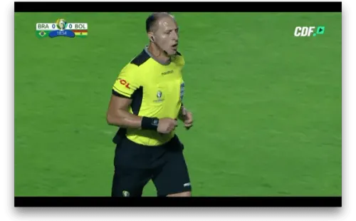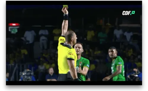 Poco antes de la media hora de juego, Néstor Pitanarevisó una fuerte entrada de Fernando Saucedo a Casemiroy, tras chequearlo, no dudó en amonestarlo.