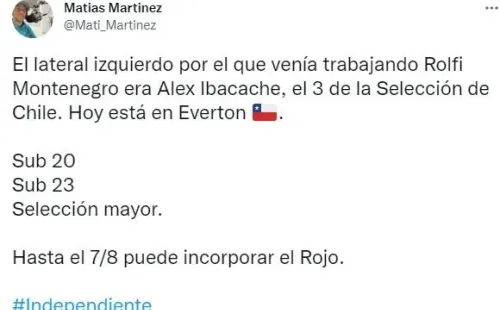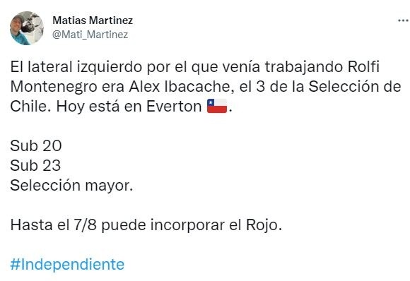 Sin embargo, piensan en fortalecer su plantilla y uno de los futbolistas que interesa es Alex Ibacache, actualmente en Everton y que ha interesado últimamente. Así lo dio a conocer el periodista de Radio La Red, Matías Martín, en una publicación hecha a través de su cuenta de Twitter.