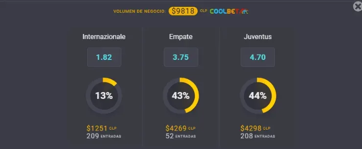 Para el OSO de Coolbet, el gran favorito para ganar la Supercopa de Italia es el Inter de Milán, que paga 1,82 veces lo que juegues por sobre los 4,70 de la Juventus, si piensas que ellos serán los triunfadores. Ahora, si eres de quienes piensa que termina en empate los 90 mintos de encuentro, paga 3,75 veces los que apuestes.