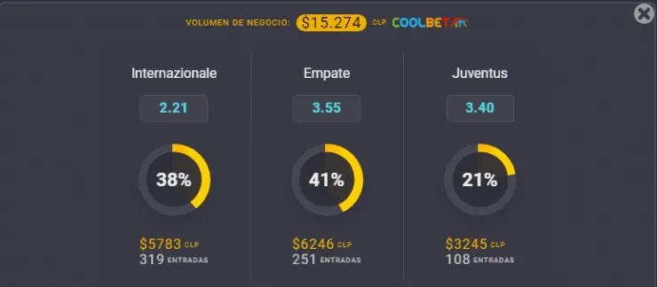 Para el OSO de Coolbet, el favorito para ganar este partido de la Serie A es Inter de Milán, de Arturo Vidal y Alexis Sánchez, que paga 2,21 veces lo que apuestes, por sobre los 3,40 que paga Juventus si piensas que será la visita quien se quede con el compromiso. Ahora, si apuestas al empate, paga 3,55 veces lo que juegues.