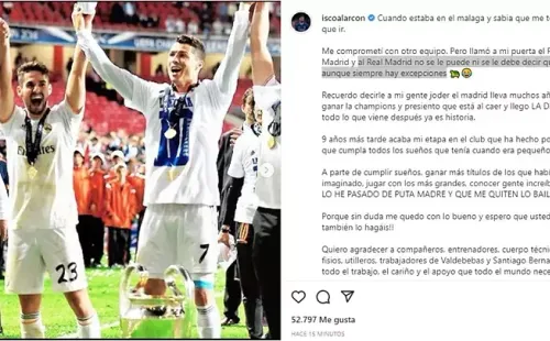 Isco, el mediocampista español de 30 años, se despidió del Real Madrid con una emotiva carta considerando el fin de la temporada y su contrato que finaliza el próximo 30 de junio tras nueve temporadas defendiendo la camiseta del cuadro merengue.