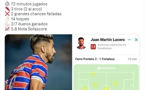 Según consignó el destacado sitio de datos, el Gato Lucero fue el jugador con peor nota en la eliminación del Fortaleza. El argentino se sacó un 5.8 tras 72 minutos, donde remató tres veces (dos al arco) y apenas tuvo 14 toques de balón, además de solo dos de siete duelos ganados.
