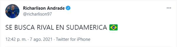 Luego del partido por la presea dorada, en el que falló un penal a la media hora, volvió a las redes sociales para hacer gala de la conquista que ha hecho con la Canarinha. “Se busca rival en Sudamérica”, puso en su cuenta de Twitter con todo en letras mayúsculas y acompañando el mensaje con la bandera de Brasil.