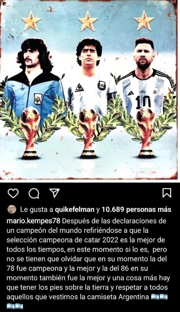 El matador no se quedó cayado y mediante Instagram señaló, sin mencionar el nombre de Rodrigo De Paul, que “después de las declaraciones de un campeón del mundo refiriéndose a que la Selección campeona de Qatar 2022 es la mejor de todos los tiempos, en este momento si lo es, perono se tienen que olvidar que en su momento la del ’78 fue campeona y la mejor y la del ’86 en su momento también fue la mejor”.