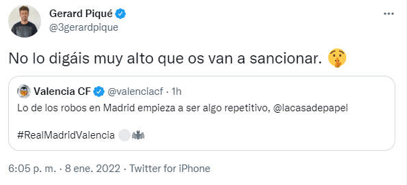 Otra de las declaraciones calientes por esta vía la hizo el siempre polémico Gerard Piqué, que citó el tuit del Valencia y agregó: “No lo digáis muy alto que os van a sancionar”, además de un emoji de silencio para ponerle un poco más de leña al fuego.