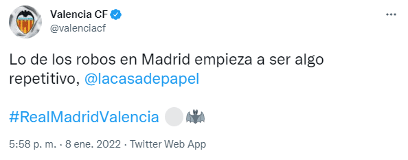 Las reacciones no se hicieron esperar pero una de las más sorpresivas vino por parte del Valencia que a través de su cuenta de Twitter no se guardaron nada con un picante mensaje. “Lo de los robos en Madrid empieza a ser algo repetitivo, @lacasadepapel”, escribieron en la mencionada red social.