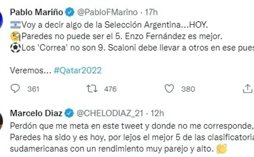 Las opiniones en Twitter siempre generan algún tipo de debate. Pero en esta última fecha de Eliminatorias Qatar 2022, Marcelo Díaz quiso dar su punto de vista a una discusión que se estaba dando en la selección de Argentina.