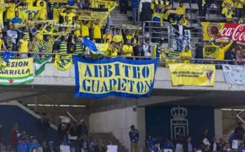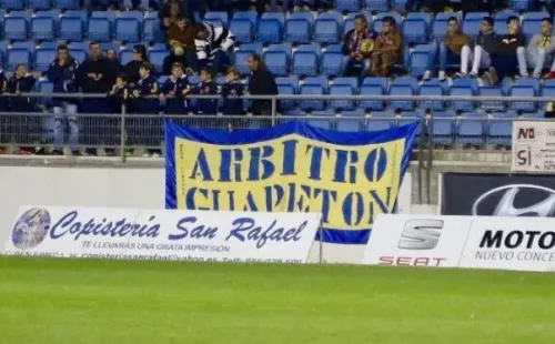 Se trata de una pancarta con la reseña “árbitro guapetón”, que aparece esporádicamente en los estadios y particularmente cuando Cádiz juega de visita, hace no menos de cuatro años. De hecho, hay una peña fundada en su honor.