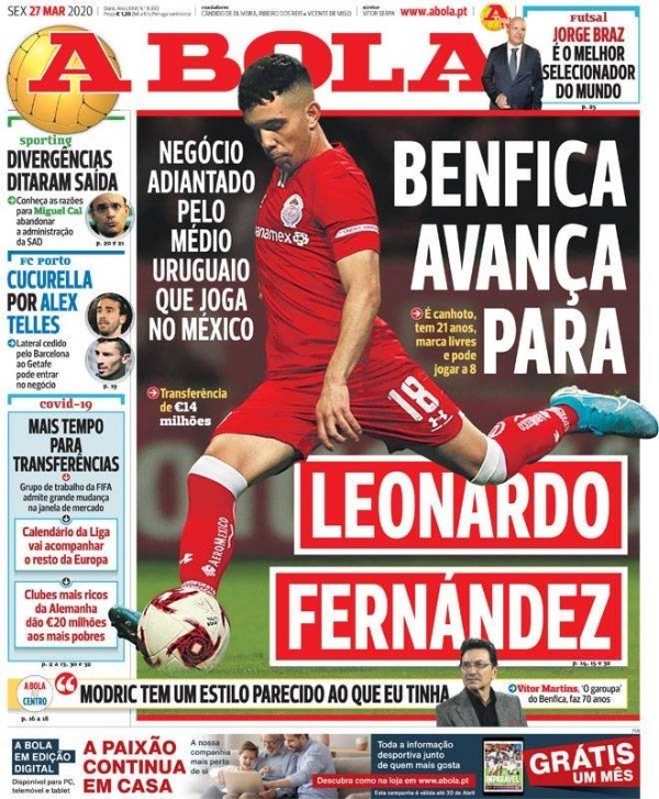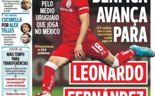 “El Benfica avanza por Leonardo Fernández”, titulan agregando que habría “acuerdo adelantado por el centrocampista uruguayo que juega en México”. A Bola complementa que el joven volante “zurdo tiene 21 años y puede jugar hasta 8”.