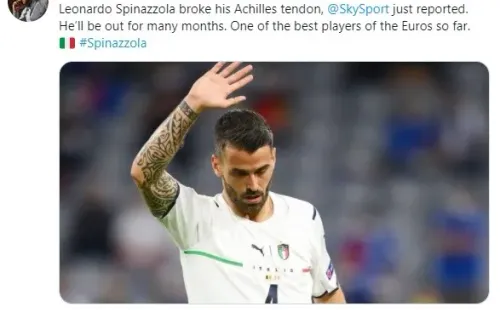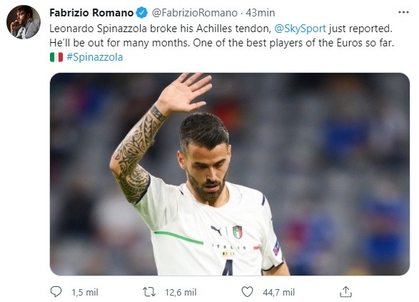 “Leonardo Spinazzola se cortó el tendón de Aquiles, acaba de informar SkySport. Estará fuera por varios meses, uno de los mejores jugadores de la Euro por lejos”, recogió Fabrizio Romano en su cuenta de Twitter.