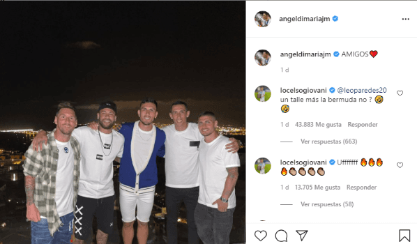 En los últimos días de sus vacaciones, el transandino estuvo en Ibiza compartiendo con jugadores del equipo francés y así se pudo ver en una fotografía que subió Ángel di María a su cuenta de Instagram en la que también estaban Leandro Paredes, Marco Verratti y su gran amigo Neymar.