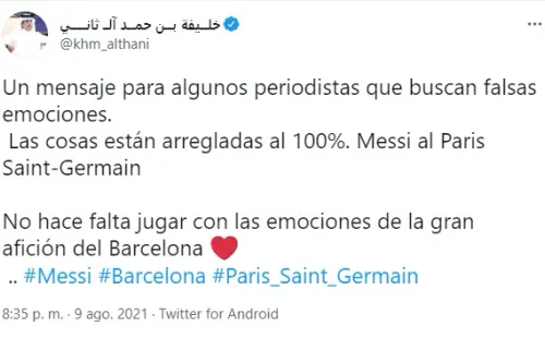 “Un mensaje para algunos periodistas que buscan falsas emociones. Las cosas están arregladas al 100%. Messi al Paris Saint-Germain. No hace falta jugar con las emociones de la gran afición del Barcelona”, escribió, en español, el miembro de la familia real a través de su cuenta de Twitter.
