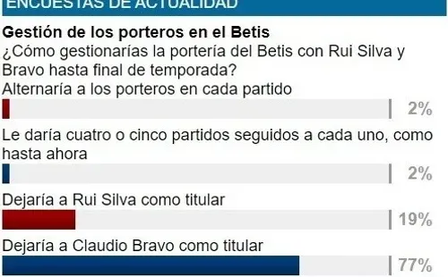 Larotación de arqueros que Manuel Pellegrini ha impuesto en el Betis durante esta temporada fue tema en Sevilla, por lo que el medio Estadio Deportivo le consultó a los fanáticos si les gusta esta decisión del Ingeniero, que alterna constantemente a Claudio Bravo con el portugués Rui Silva.