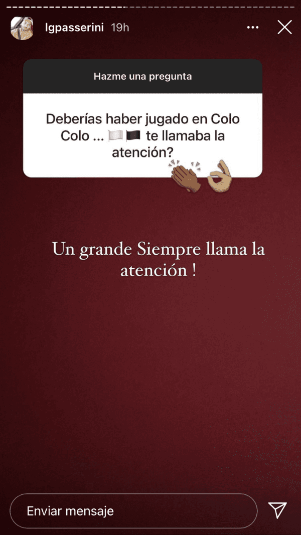 Pero una publicación en Instagram encendió la ilusión de los hinchas albos por tenerlo en el Estadio Monumental. A través de sus historias, Passerini permitió preguntas de sus seguidores y ahí uno le señaló que “deberías haber jugado en Colo Colo… ¿Te llamaba la atención?“.