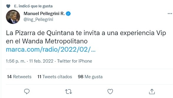 “La Pizarra de Quintana te invita a una experiencia Vip en el Wanda Metropolitano”, escribió la cuenta @Ing_Pellegrini a las 13:56 horas, con el enlace roto de una promoción de la web de diario Marca, en la que aparece el destacado periodista Miguel Quintana.