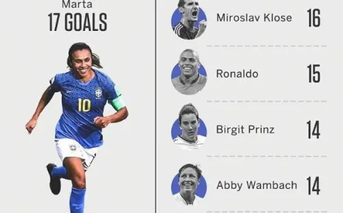 Además, la talentosa 10 de la canarinha posee el registro de anotar goles en cinco mundiales consecutivos, en Estados Unidos 2003, China 2007, Alemania 2011, Canadá 2015 y Francia 2019.