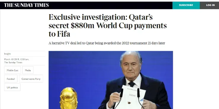 Según el citado medio inglés, Al-Jazeera firmó en 2010, tres semanas antes del anuncio de las sedes,un acuerdo de derechos de transmisión por TV de la Copa del Mundo de 2022 en la que se ofrecía un bono de US$ 100 millones en caso de que Catar fuera elegida sede del Mundial, cosa que efectivamente ocurrió.