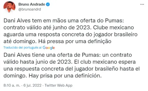 El profesional de la comunicación afirmó que le ofrecieron contrato hasta junio de 2023 pero que tienen prisa por cerrar la negociación y esperarán hasta estedomingo 10 de julio por una respuesta de Dani Alves. Pumas se ha movido fuerte en este mercado y ya contrató a Eduardo Salvio al salir de Boca Juniors.