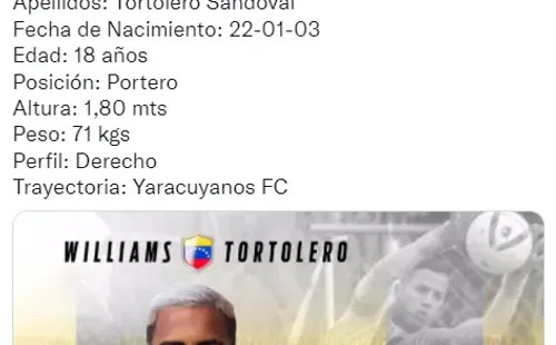 Lo más llamativo del caso es queWilliams IvannisstenrroyTortolero es portero. Con 18 años ya ha hecho historia en su liga pues se convirtió en el guardameta más joven en debutar en el torneo a los 17 años, nueve meses y tres díasa uno de los equipos más populares del fútbol venezolano.