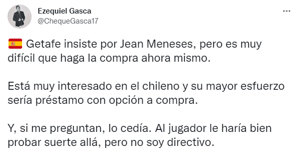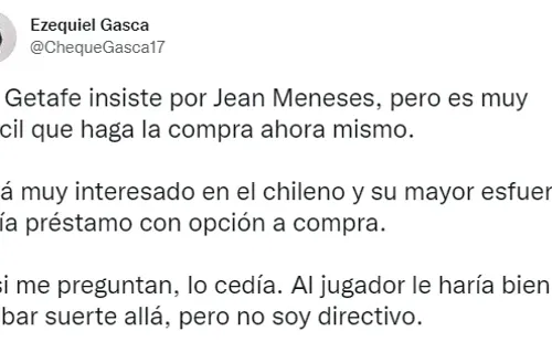 “Getafe insiste por Jean Meneses, pero es muy difícil que haga la compra ahora mismo. Está muy interesado en el chileno y su mayor esfuerzo sería préstamo con opción a compra. Y, si me preguntan, lo cedía. Al jugador le haría bien probar suerte allá, pero no soy directivo”, escribió el reportero en su cuenta de Twitter.