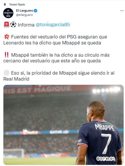 De acuerdo a la información, el director deportivo del cuadro parisino, el brasileño Leonardo, ya le hizo saber a gran parte de la plantilla que Mbappé se quedaría por esta campaña y que, inclusive, el habilidoso jugador también se lo comunicó a su círculo más cercano dentro del camarín.