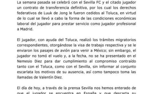 “Los derechos federativos de Luuk de Jong le fueron cedidos al Toluca, en virtud de lo cual se llevó a cabo la forma de las condiciones económicas laboral del jugador para prestar servicio como profesional”, afirmó el texto difundido a través de las redes sociales de la institución, en donde enfatizaron su molestia.
