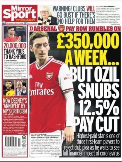 Pero en Inglaterra, se desató el escándalo luego que el Mirror llevara en portada al jugador del Arsenal, Mesut Özil, rechazó el reajuste del 12, 5% que propuso el ex cuadro de Alexis Sánchez.