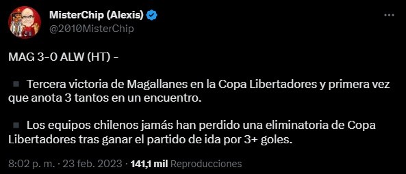 Por otro lado, el estadístico consigna que esta es la “tercera victoria de Magallanes en la Copa Libertadores y primera vez que anota 3 tantos en un encuentro. Los equipos chilenos jamás han perdido una eliminatoria de Copa Libertadores tras ganar el partido de ida por 3+ goles”.