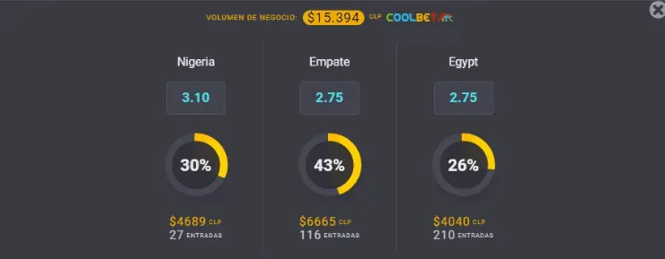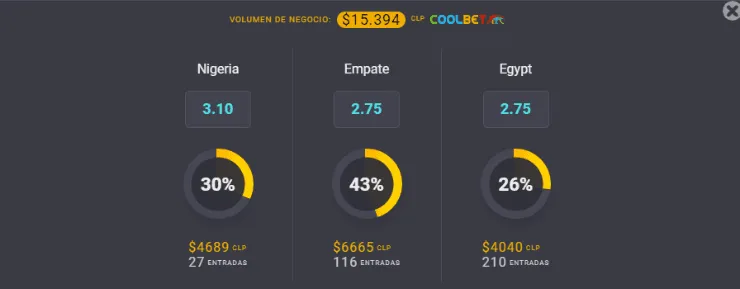 Para el OSO de Coolbet, el gran favorito para ganar en este partido de la Copa Africana de Naciones es Egipto, que paga 2,75 veces lo que juegues, por sobre los 3,10 veces que paga la victoria de Nigeria. Ahora, si piensas que este partido termina en empate, paga 2,75 veces lo que apuestes.