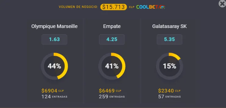 El OSO de Coolbet te cuenta que el favorito para ganar este partido de la UEFA Europa League es Olympique de Marsella, que paga 1,63 veces lo que juegues, por sobre los 5,35 que paga Galatasaray, si crees que los turcos dan la sorpresa en el partido. Ahora, el empate entre ambos paga 4,25 veces lo que apuestes.