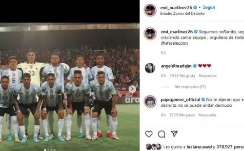 Martínez compartió una foto de la albiceleste tras el triunfo con la frase “seguimos soñando, seguimos creciendo como equipo , orgulloso de todos”, instancia que el Papu aprovechó para dejarle un pícaro mensaje.