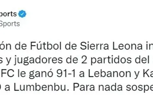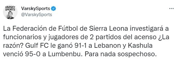 “La Federación de Fútbol de Sierra Leona investigará a funcionarios y jugadores de 2 partidos del acenso ¿La razón? Gulf FC le ganó 91-1 a Lebanon y Kahula venció 95-0 a Lumbenbu. Para nada sospechoso”, destaca Varsky en sus redes sociales.