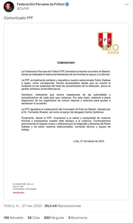 Además, anunciaron que la federación “respalda a nuestro seleccionado Pedro Gallese a quien, como corresponde, hemos acompañado desde que se suscitó el incidente en los exteriores del hotel de concentración de la Selección, previo al amistoso contra Marruecos“.