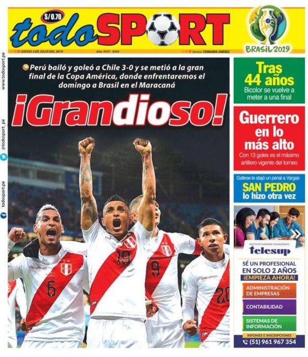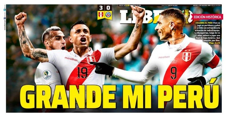 En Perú todo es alegría tras dejar fuera de la carrera por el título de Copa América a Chile. El cuadro del Rimac tuvo su venganza de la edición 2015, donde quedaron eliminados por la Roja en la misma instancia, y se metieron en la definición por el campeonato.