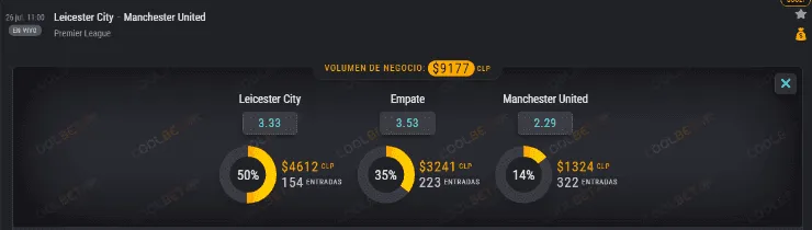 El OSO de Coolbet te cuenta que el favorito para ganar este partido es el Manchester United, que paga 2.29 veces lo que apuestes, en desmedro de los 3.33 que paga el Leicester City. Ahora, si crees que terminará en empate, paga 3.53 veces lo que juegues.