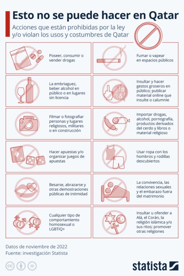 Durante el Mundial de Qatar está prohibido el uso de cualquier tipo de droga quién sea sorprendido será multado con 51.000 euros y podría ir a la cárcel entre 7 y 15 años. Además las mujeres no podrán llevar escotes y tendrán que llevar los hombros cubiertos, por lo que la vestimenta tendrá que ser pantalones o vestidos que lleguen hasta la rodilla.