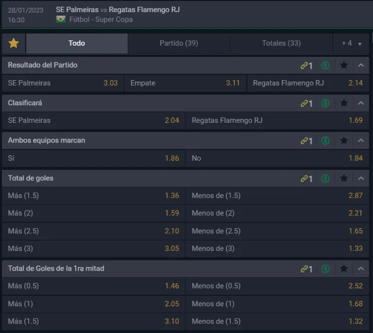 También puedes jugar en cientos de mercados de cara a este duelo de Flamengo y Palmeiras por la final de la Supercopa de Brasil.