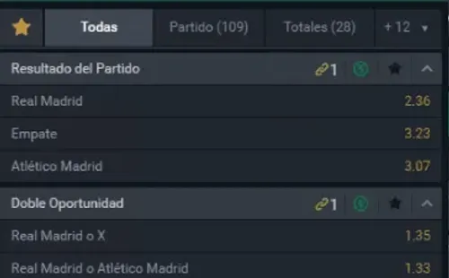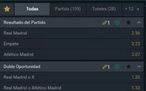 SI te la quieres jugar con Betsala por un favorito para ganar el Derbi de Madrid, te contamos que quien toma la ventaja en la previa es el Real Madrid, que paga 2.36 veces lo que juegues, por sobre los 3.07 del Atlético de Madrid. Pero, si eres de quienes piensa que termina en empate, paga 3.23 veces lo que apuestes.