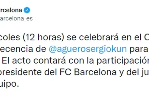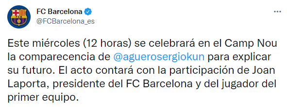 “Este miércoles (12 horas) se celebrará en el Camp Nou la comparecencia de @aguerosergiokun para explicar su futuro. El acto contará con la participación de Joan Laporta, presidente del FC Barcelona y del jugador del primer equipo”, escribió en un corto comunicado el club culé en su cuenta de Twitter.