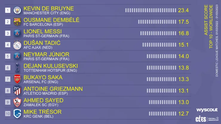 La clasificación totalizó las asistencias de cada jugador en las mencionadas ligas y ponderó la cantidad con el nivel o índice de dificultad de la liga en la que participan. Por esta razón, De Bruyne se impone con 18 pases gol contra tres futbolistas que suman 19, pero en torneos de menor relevancia.