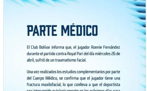 Parecía que quedaba todo ahí. Sin embargo, este jueves el club boliviano lo sometió a unos exámenes y se determinó que el chileno, ex Universidad de Chile sufrió una fractura maxilofacial y deberá someterse a cirugía a la brevedad. Esto significa que será baja por tiempo indeterminado en el club paceño.