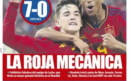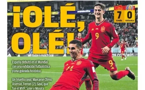 Por su parte, el catalán Diario Sport lleva en portada “¡olé, olé”. Destacan que “España debutó en el Mundial con una exhibición futbolística y una goleada histórica” agregando que fue “un triunfo coral: marcaron Olmo, Asensio, Ferran (2), Gavi que fue el MVP, Soler y Morata”.