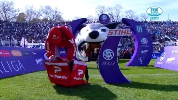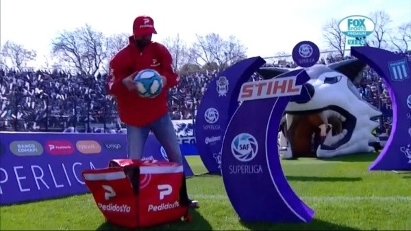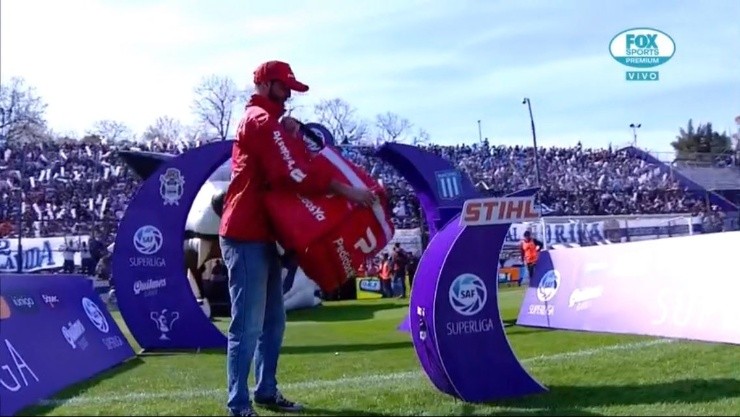 Además, Maradona arengó a los hinchas del Lobo y como detalle, la pelota para el duelo ante Racing llegó en un servicio de delivery.