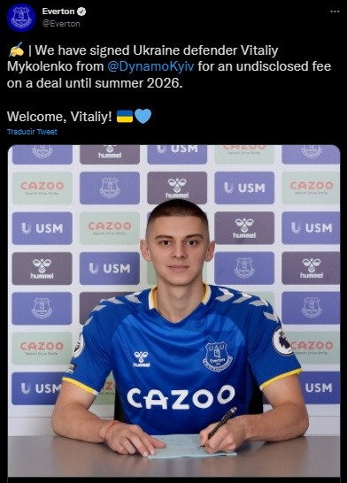 “Hemos fichado al defensa ucraciano Vitaliy Mykolenko desde el Dinamo Kiev hasta el verano de 2026”, publicaron los Toffes en redes sociales junto a la foto del jugador firmando su contrato.