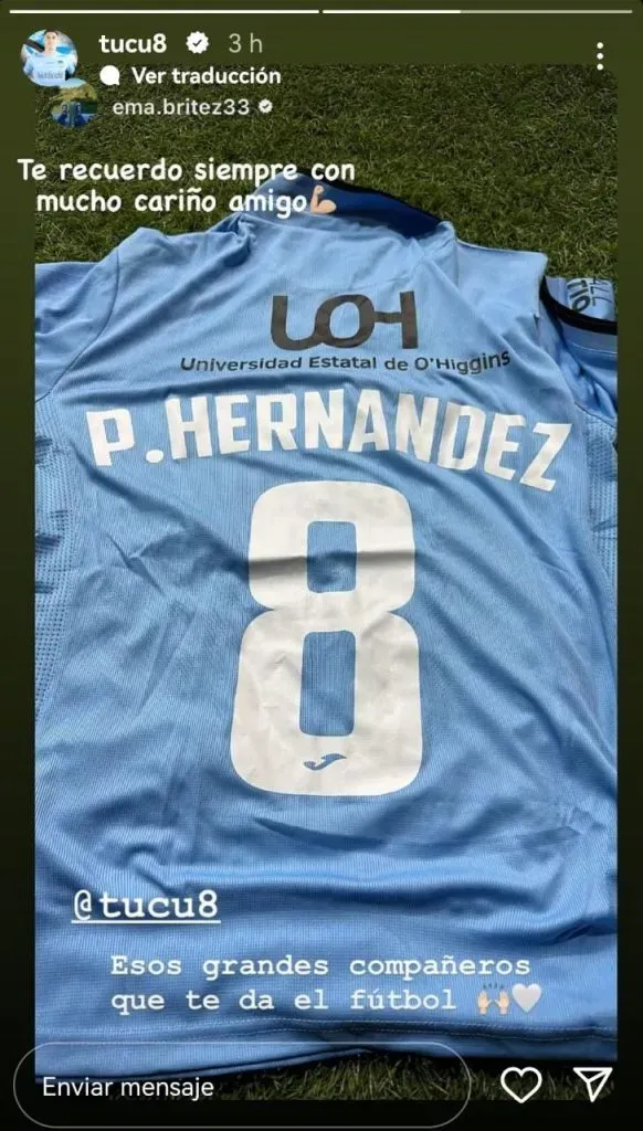 Por cierto, Pedro Pablo Hernández le respondió, también con afecto. “Qué alegría de verte, hermano”, posteó en Instagram el futbolista, campeón con el cuadro rancagüino en 2013. Eso sí, Romero no fue el único que se llevó un recuerdo del Tucu, aunque él también dejó su casaquilla como obsequio.
