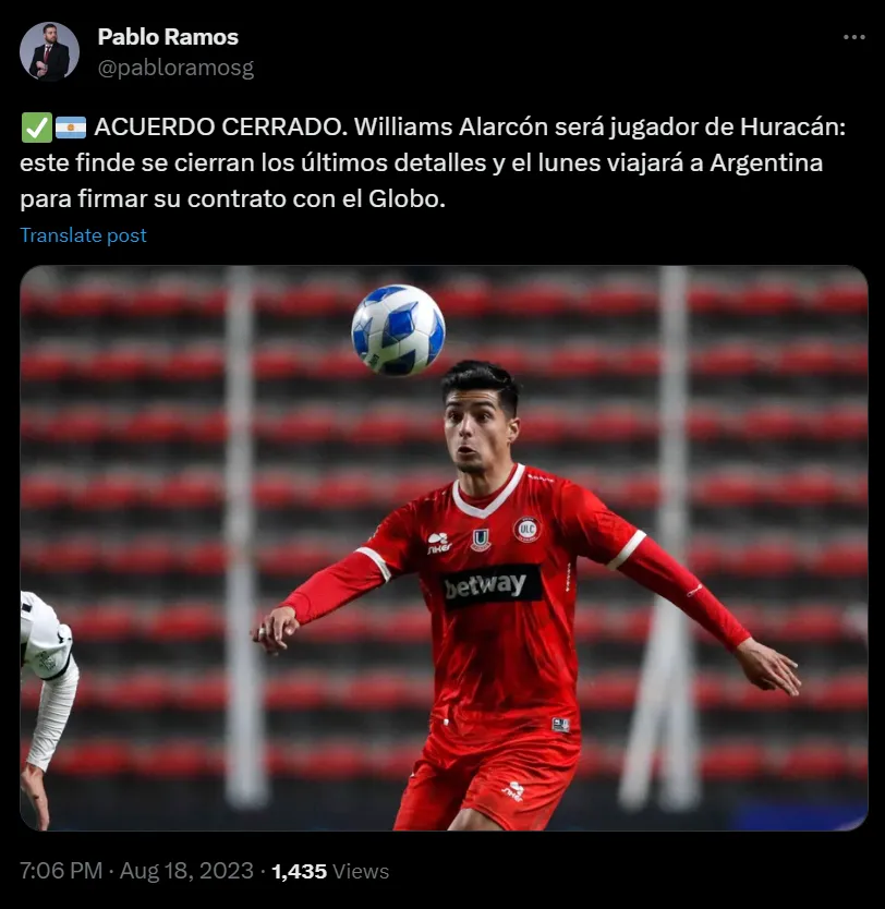 Así al menos lo reportó el periodista Pablo Ramos, quien hace unos días había dado cuenta del interés desde suelo trasandino en fichar al centrocampista. “Acuerdo cerrado, Williams Alarcón será jugador de Huracán”, tuiteó el conductor de Sportscenter.